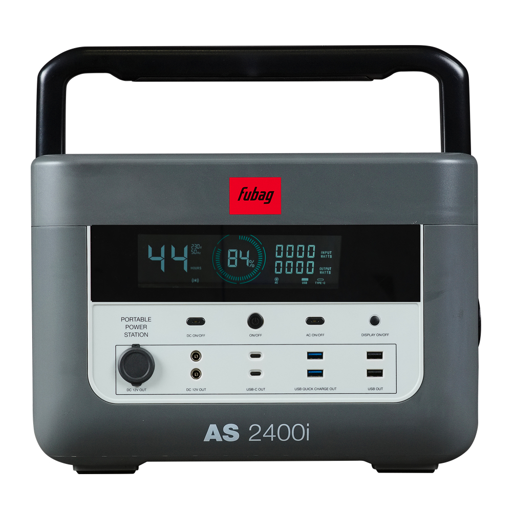 FUBAG AS 2400i — более мощная электростанция с аккумулятором 1075 Вт·ч, выдающая 1200 Вт в номинале и до 2400 Вт в пике. Станция сочетает компактность и высокую производительность: она весит 16,5 кг и заряжается от сети мощностью 800 Вт до 80% всего за 1 час. Для автономной работы предусмотрено подключение солнечных панелей мощностью до 400 Вт. Рабочие температуры позволяют использовать устройство при разряде даже в мороз до -20 °C.